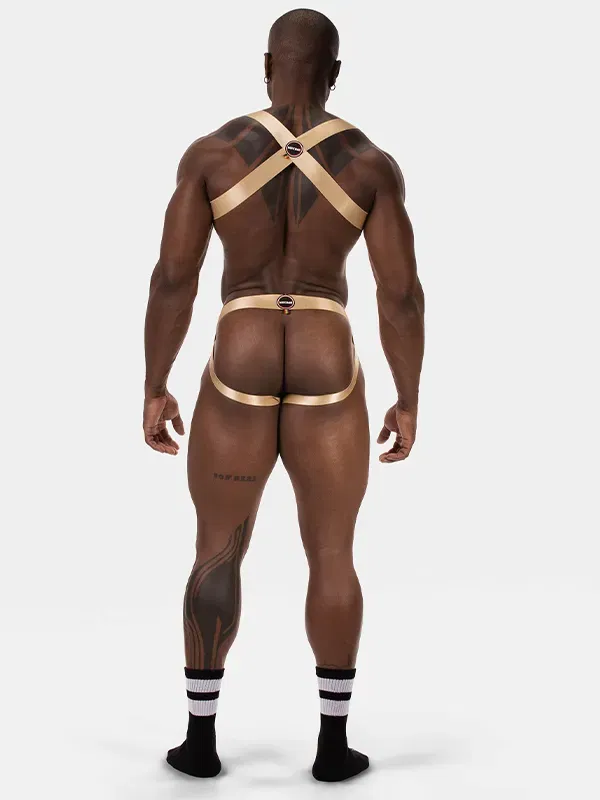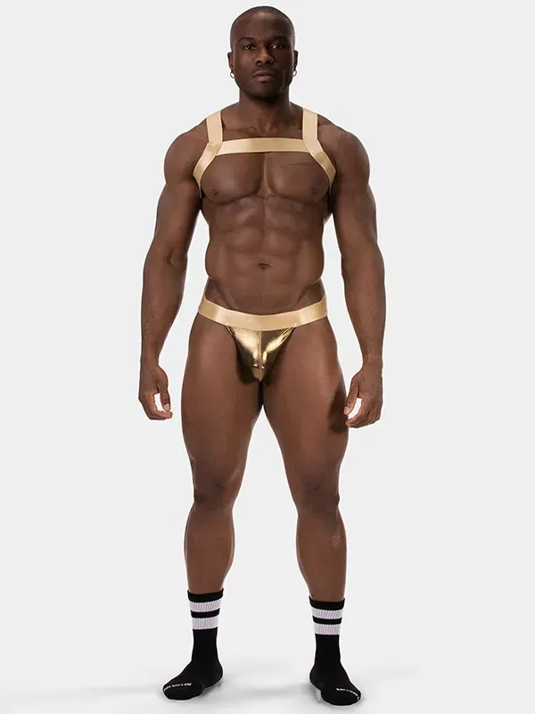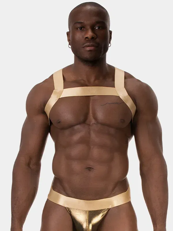 Si el plata es ingeniería fría, el arnés de pecho para hombre Barcode Berlin Dono Gold es opulencia industrial. Esta pieza construye una arquitectura poderosa sobre el torso utilizando bandas elásticas anchas con un acabado dorado metalizado (Gold). No es un brillo discreto; es una declaración de intenciones que captura la luz con calidez, diseñada para dominar visualmente la parte superior de tu look.