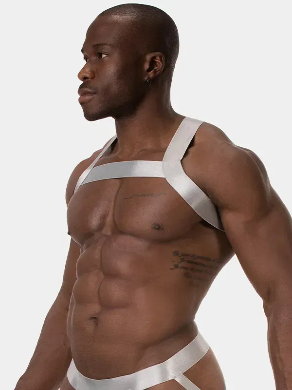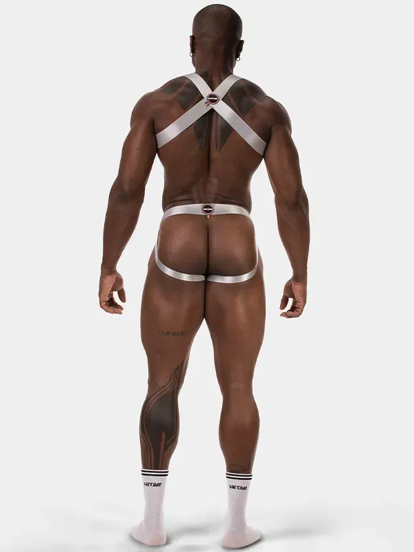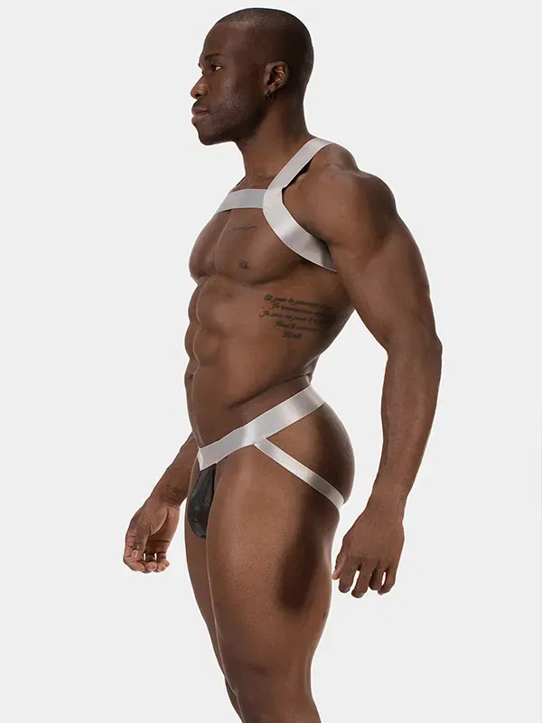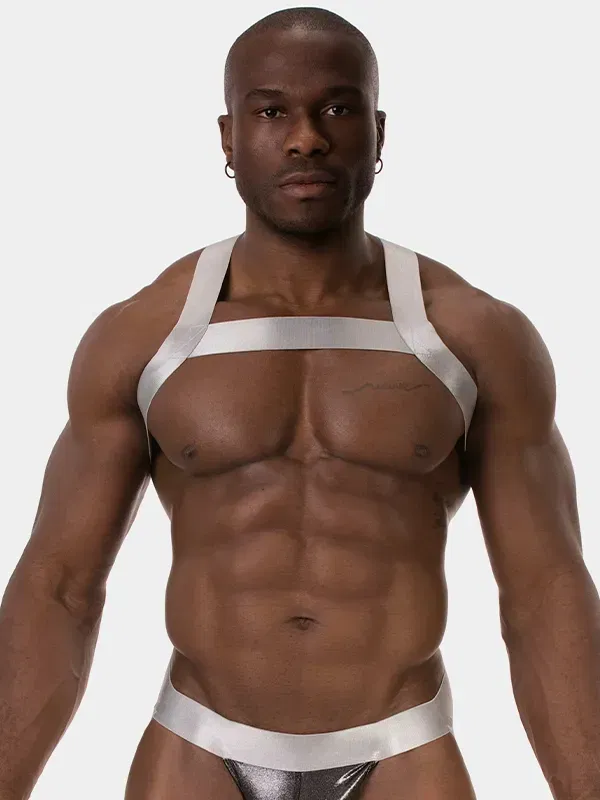 Esto no es decoración; es arquitectura corporal. El arnés de pecho para hombre Barcode Berlin Dono Silver enmarca el torso con precisión milimétrica, utilizando bandas elásticas anchas con un acabado plateado técnico (Silver). La luz resbala sobre la superficie con un reflejo frío y metálico, diseñado para destacar en entornos industriales o bajo iluminación de club.