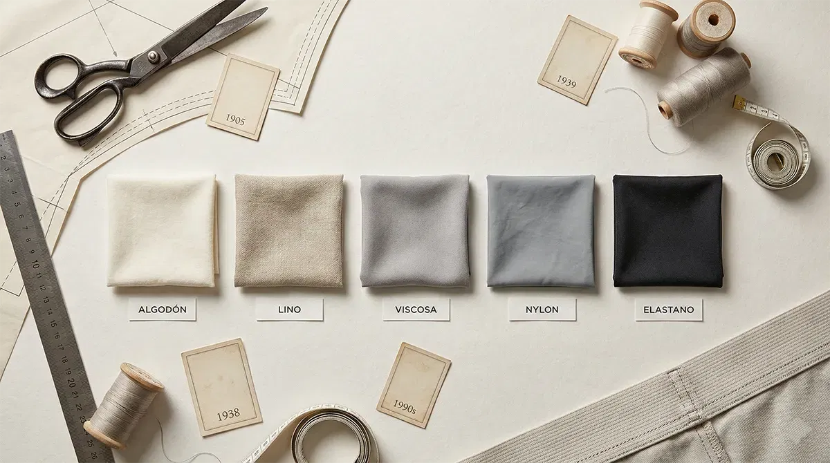 - Materiales: del lino y lana a fibras celulósicas (rayón/viscosa, modal) y a sintéticos elásticos.