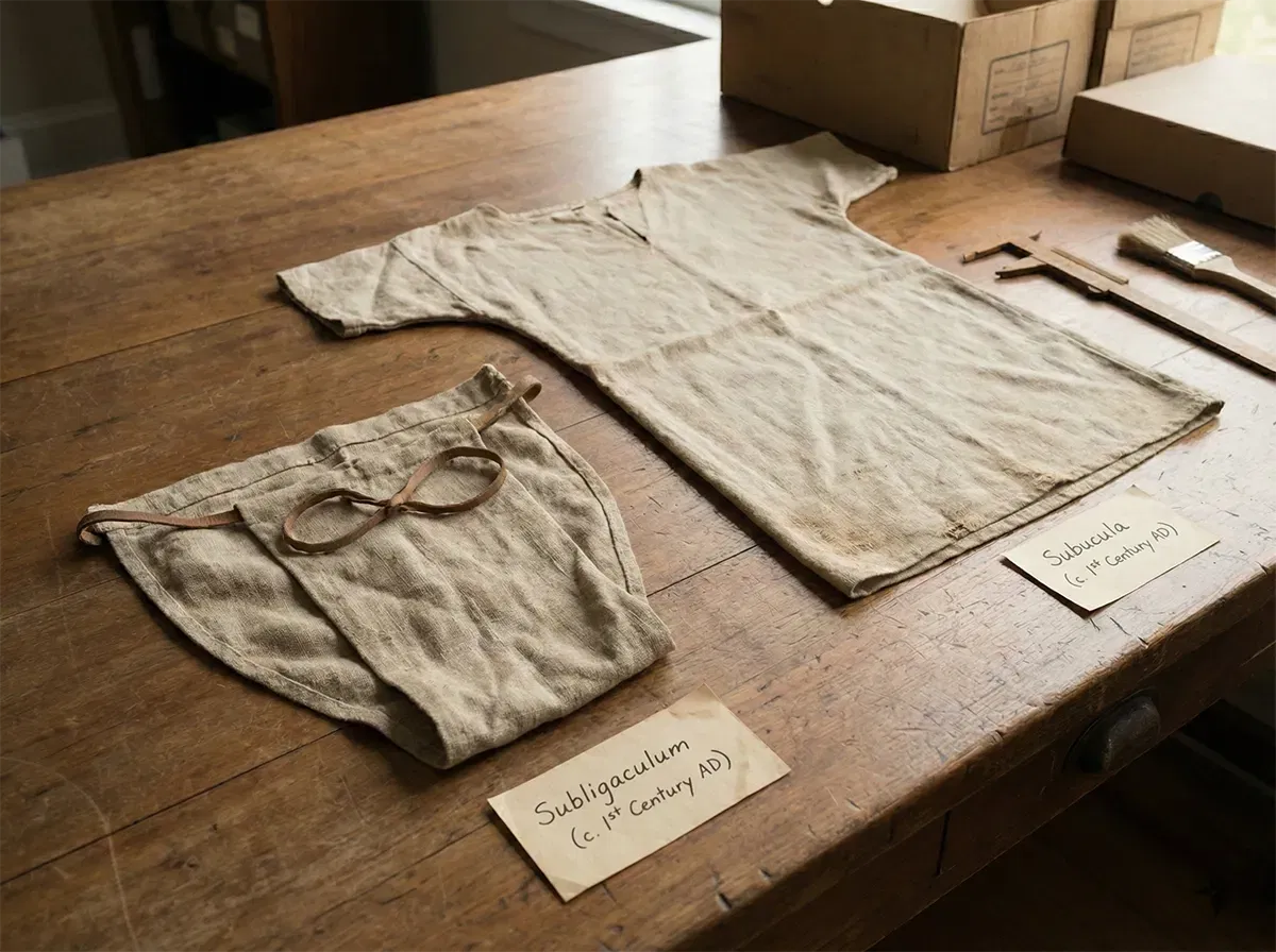 En el mundo romano existían prendas interiores sencillas como el subligaculum, una pieza básica que se llevaba bajo la ropa exterior o en contextos deportivos/escénicos.