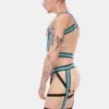 Este diseño combina en una sola pieza dos clásicos del universo fetish: un arnés de pecho cruzado por la espalda y un arnés de piernas que enmarca muslos y glúteos con una geometría perfecta. Entre ambos, tiras elásticas recorren el torso creando una estructura visual que potencia tu silueta, estiliza y proyecta pura dominación estética.