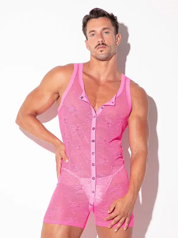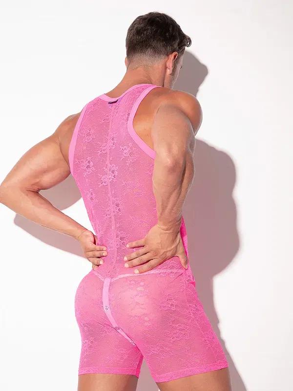 - Body de encaje para hombre en color rosa flúor, ligero y transparente.