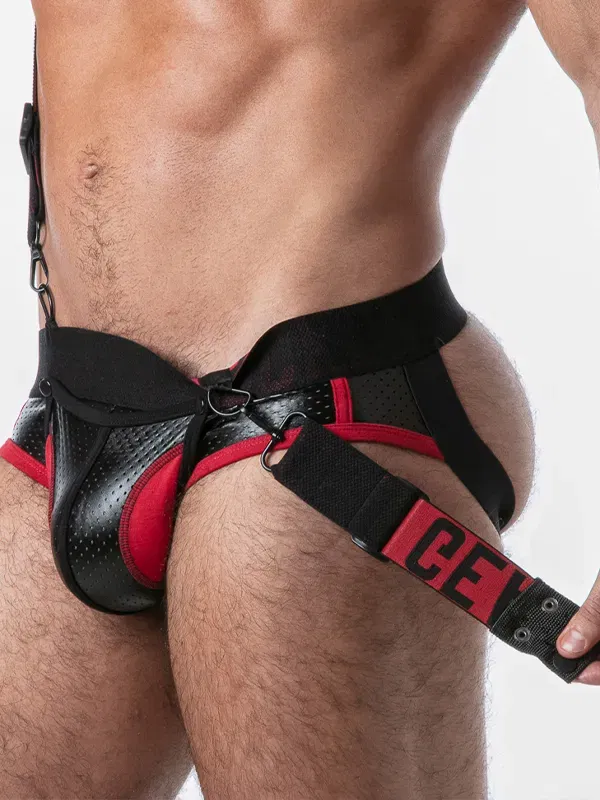 Completa el look con un jockstrap Locker Gear negro rojo y los