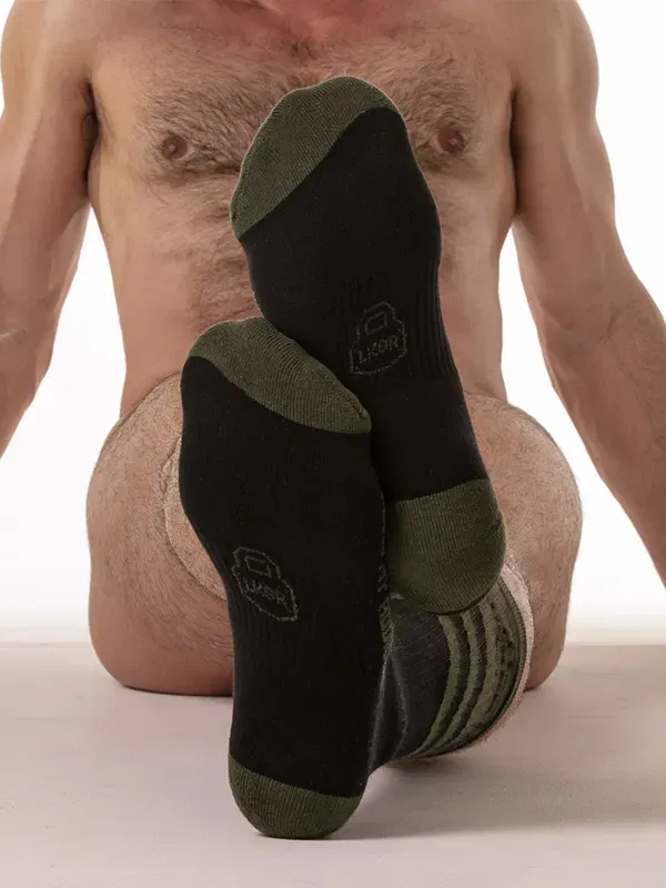 Activa tu lado más fetish con estos calcetines largos para hombre en negro y khaki. El algodón suave abraza el pie, mientras el elastano les da la elasticidad justa para seguirte el ritmo en la calle, en el gym o bajo las luces del club.