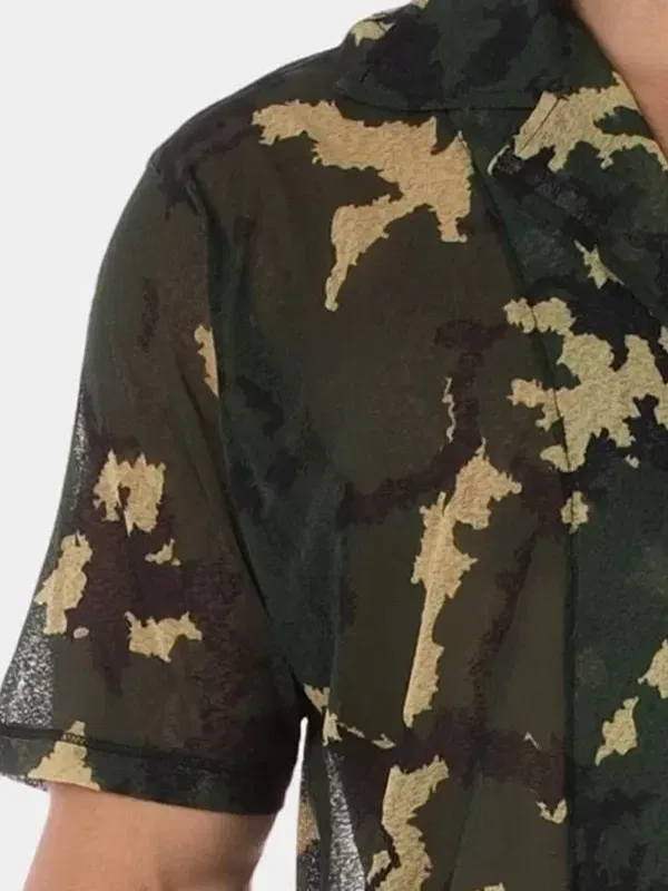 La Camisa Barcode Berlin Camo mezcla tejido mesh transparente con un estampado de camuflaje en verdes y khaki.