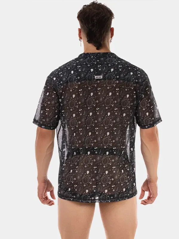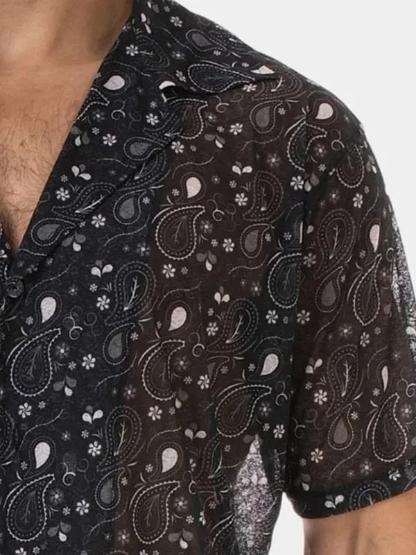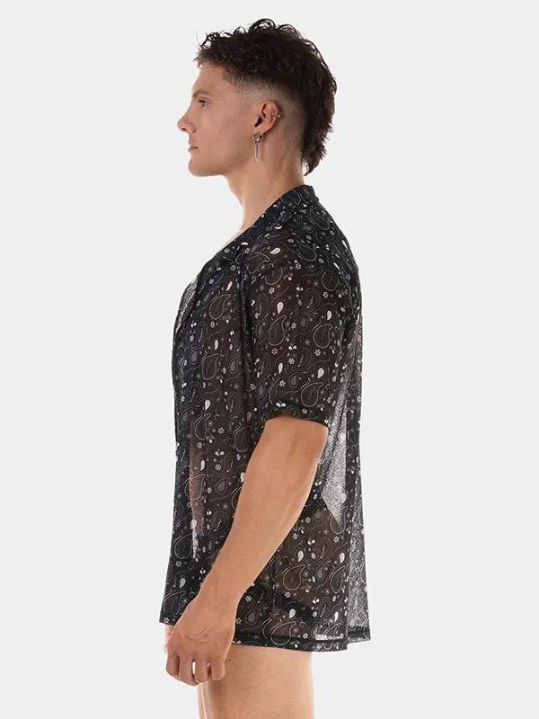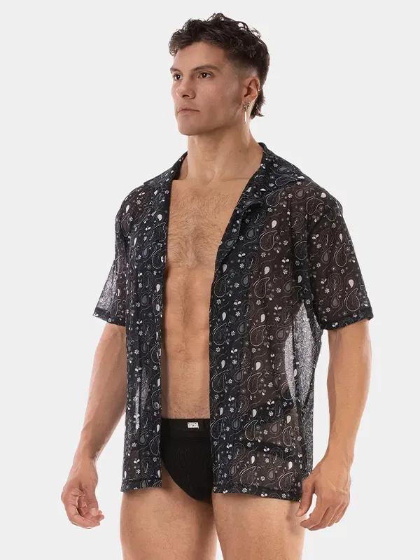 La Camisa Barcode Berlin Paisley Negra combina tejido transparente con un clásico estampado paisley en negro y gris.