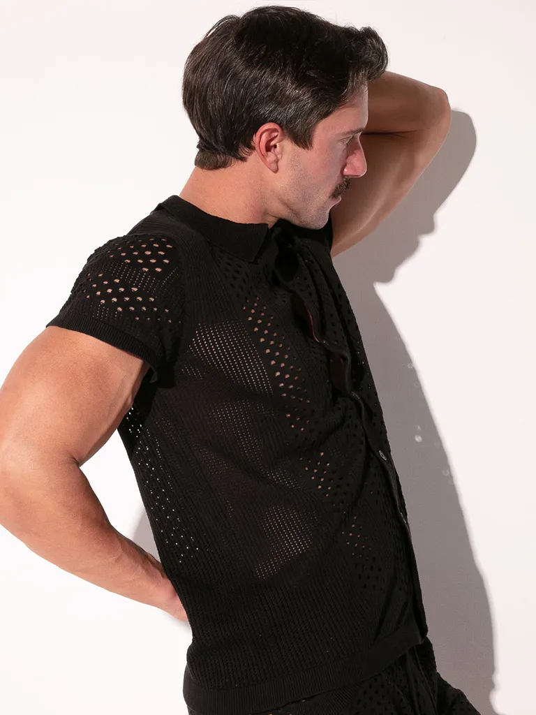 Camisa de punto calado Code 22 Mosaic Negra: algodón, manga corta y diseño geométrico