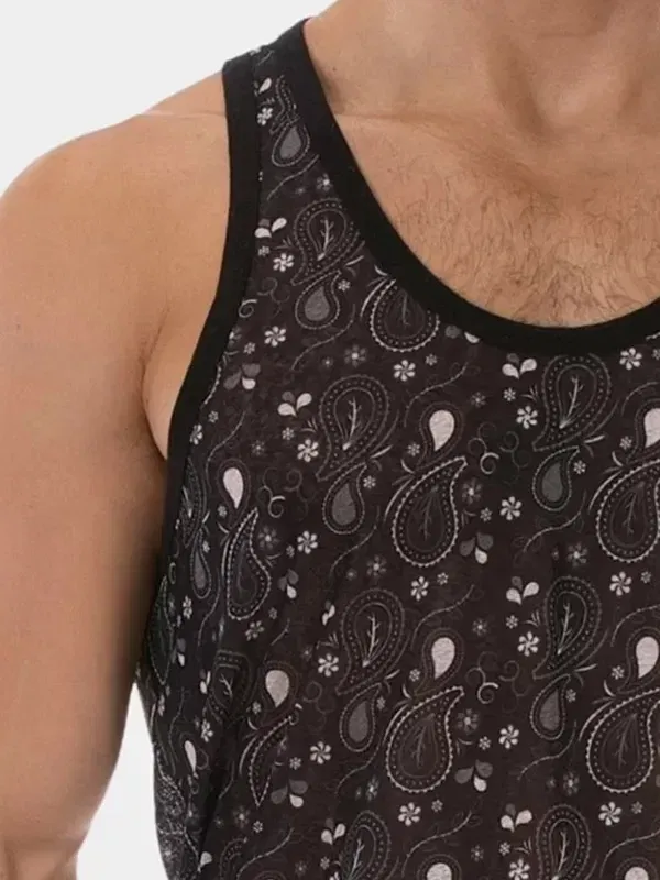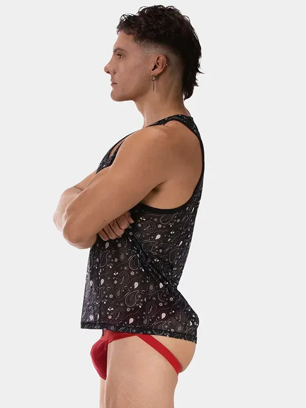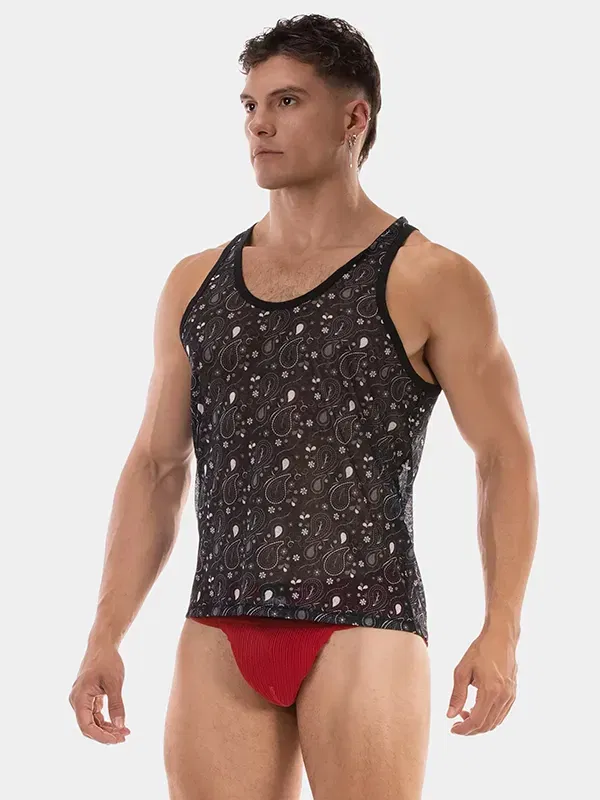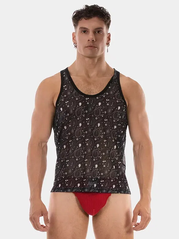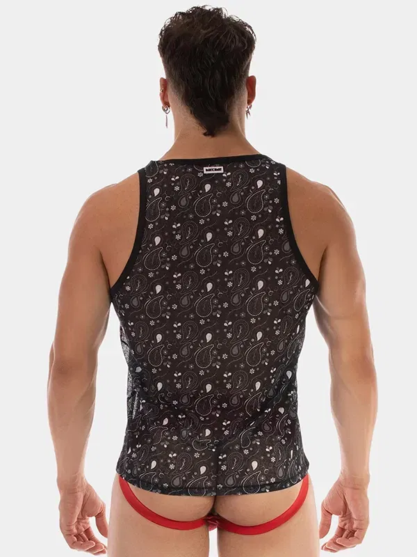 La Camiseta de Tirantes Barcode Berlin Paisley Negra combina tejido mesh transparente con un estampado paisley en negro y gris.