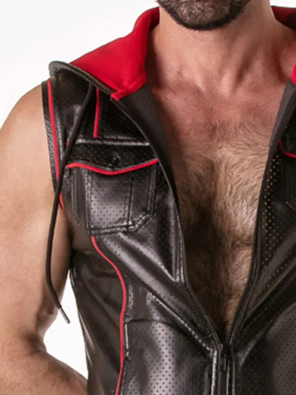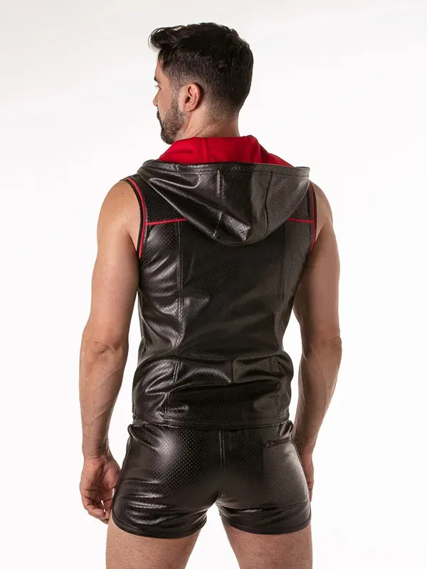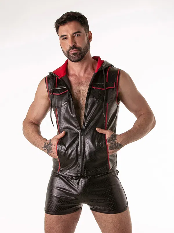 Luces cuero, respiras cómodo. El chaleco Locker Gear Rub It Hoodie negro rojo suma todo lo que buscas en un look fetish de club: