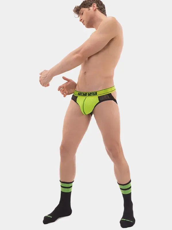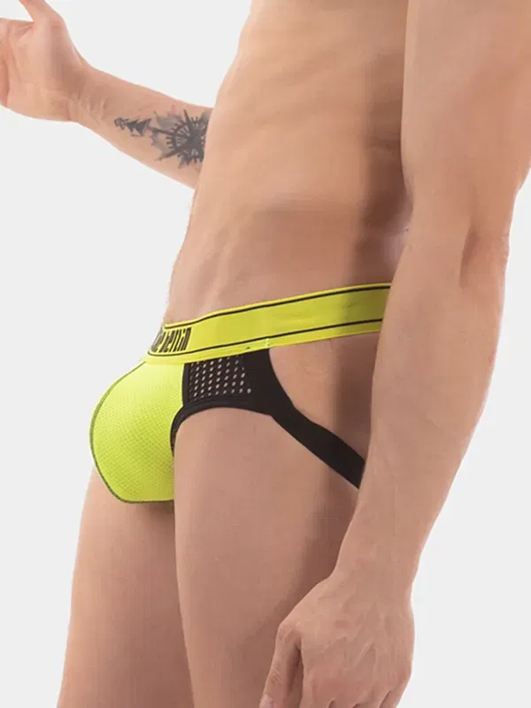 Añádelo al carrito si buscas un suspensorio para hombre ligero, con laterales de rejilla y color neongreen para un look deportivo de alto contraste.