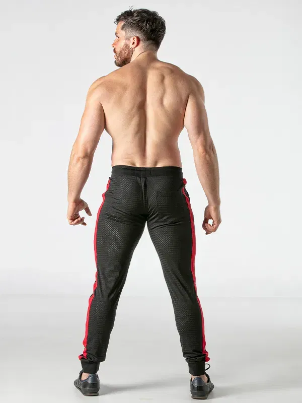 Hay noches en las que quieres algo más que un simple pantalón deportivo. Este jogger mesh negro con banda roja de la línea Look At está pensado para eso: