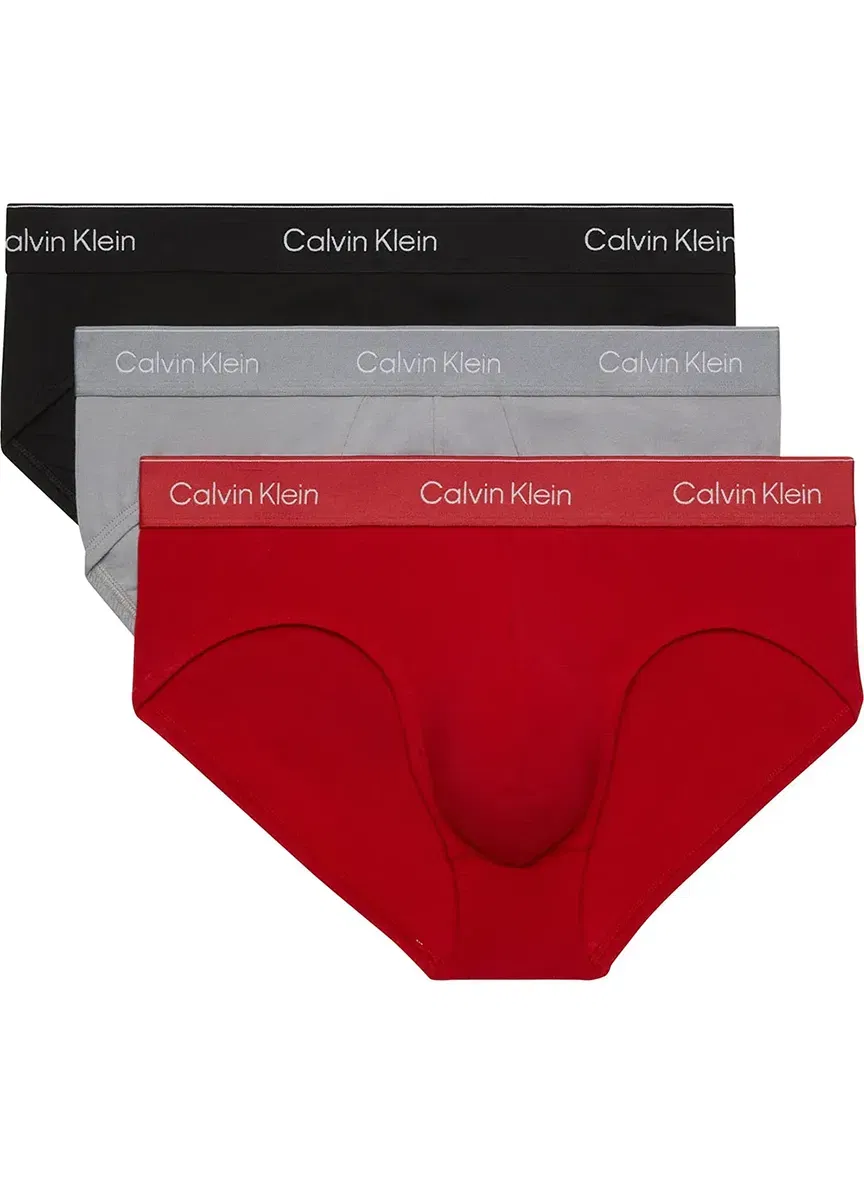 Cinturilla icónica con logo, corte hip brief de tiro bajo y bolsa contorneada que sujeta sin comprimir. Colores del pack: rojo, gris y negro.