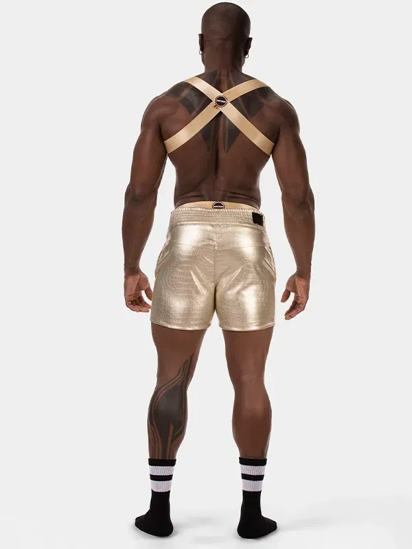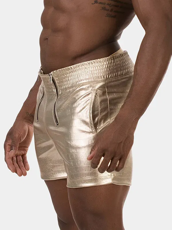 El Short Aligo Gold eleva el concepto de prenda metalizada mediante la textura. Su superficie presenta un acabado dorado con relieve aligator que añade una riqueza visual inmediata y rompe el brillo plano. El diseño se estructura mediante una doble cremallera frontal, un detalle de hardware visible que contrasta con el tono cálido del tejido y define la simetría de la prenda.