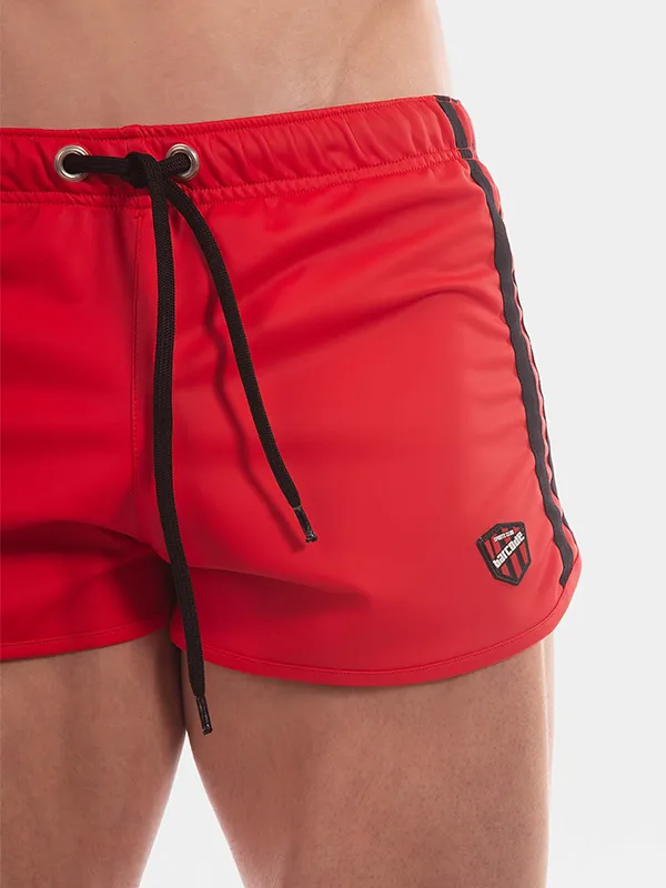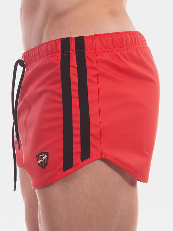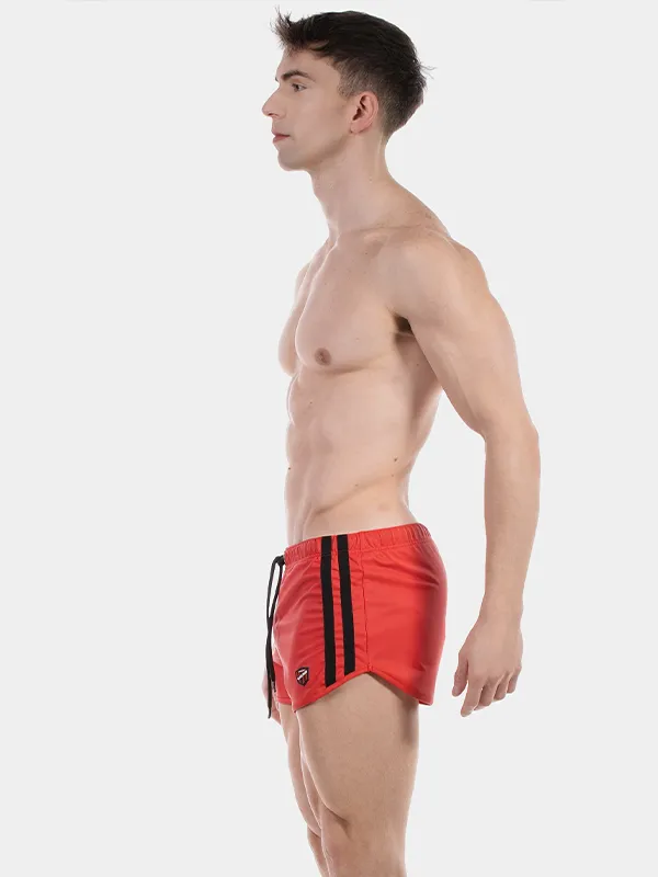 El Short Barcode Berlin Byron Laboratory Rojo es un short efecto cuero para hombre con una lectura claramente deportiva retro y una ejecución mucho más marcada que la de un pantalón corto básico. El acabado leather look, el rojo intenso, el cordón frontal ajustable en contraste y las franjas laterales negras convierten este modelo en una pieza visualmente potente dentro de la categoría de pantalón corto masculino.