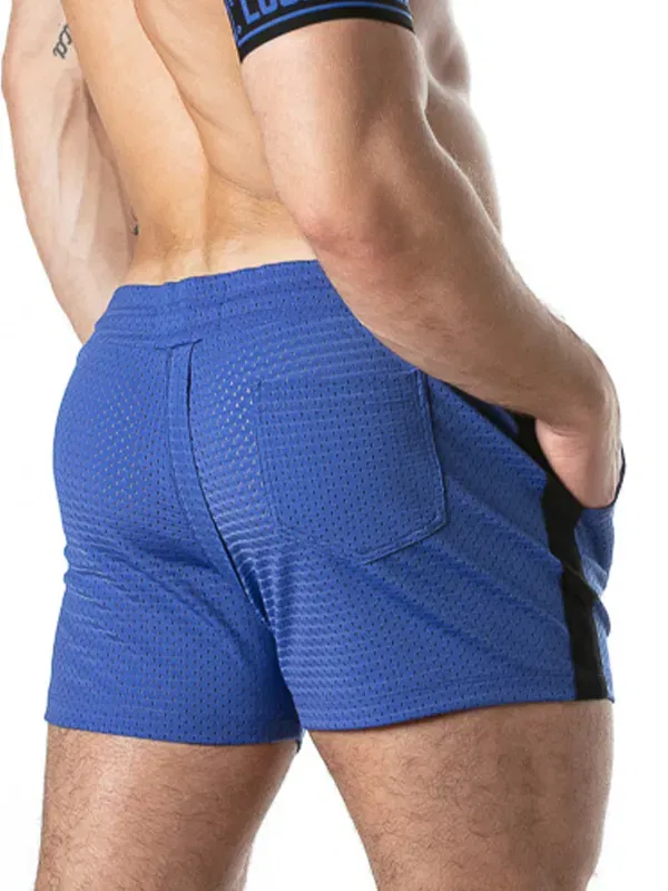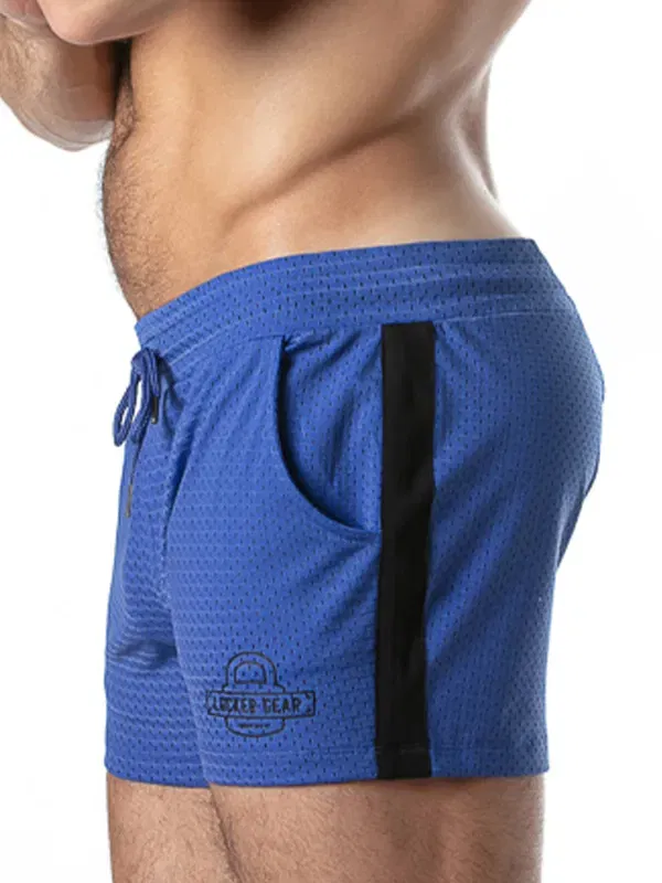 Un pantalón corto de rejilla deportiva transpirable en azul intenso, con banda lateral negra y
