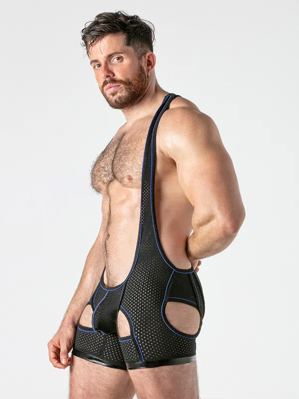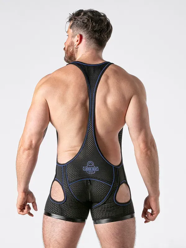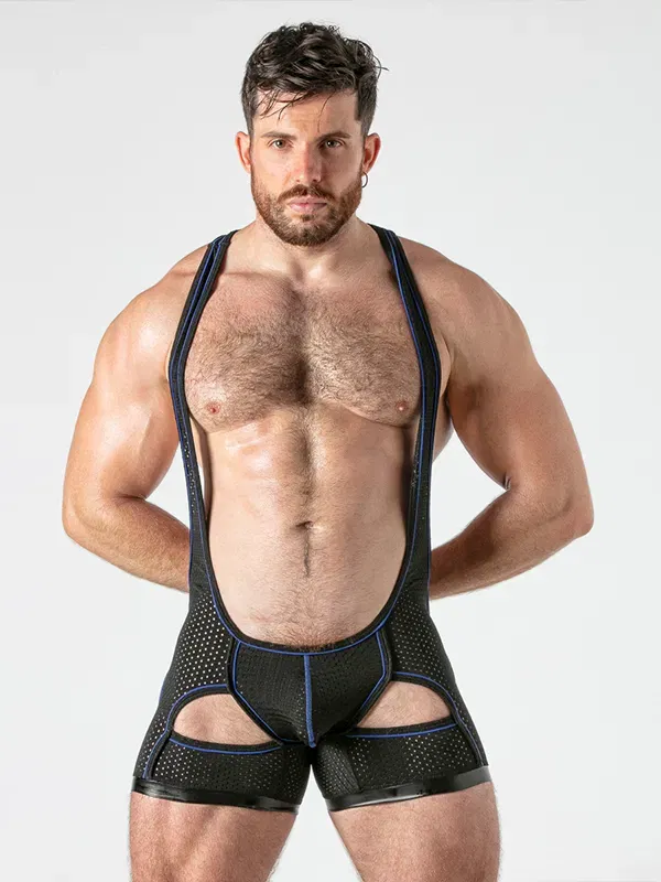 El patrón tipo luchador marca espalda y hombros, mientras que el frontal cae muy bajo para dejar el pecho prácticamente al descubierto. En las piernas, las aperturas redondeadas en los muslos rompen la silueta clásica del singlet y añaden ese toque de escenario que pide pista, música alta y mucha actitud.