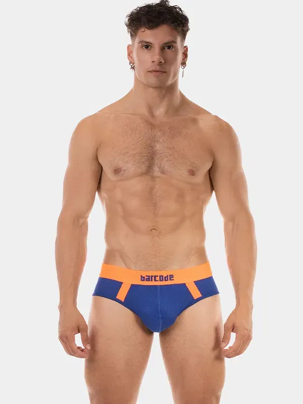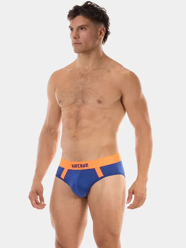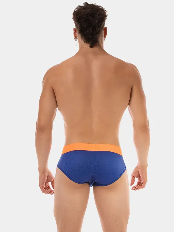 Azul royal potente y un contraste neón naranja que manda. Este slip de malla elástica respira de verdad y mantiene la frescura incluso cuando aprieta el calor. La cintura acanalada con logo aporta sujeción firme sin apretar; los dos tirantes verticales dan un guiño deportivo y estilizan la cadera.
