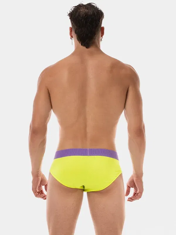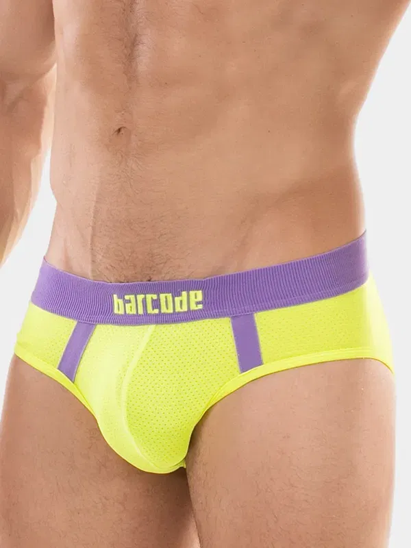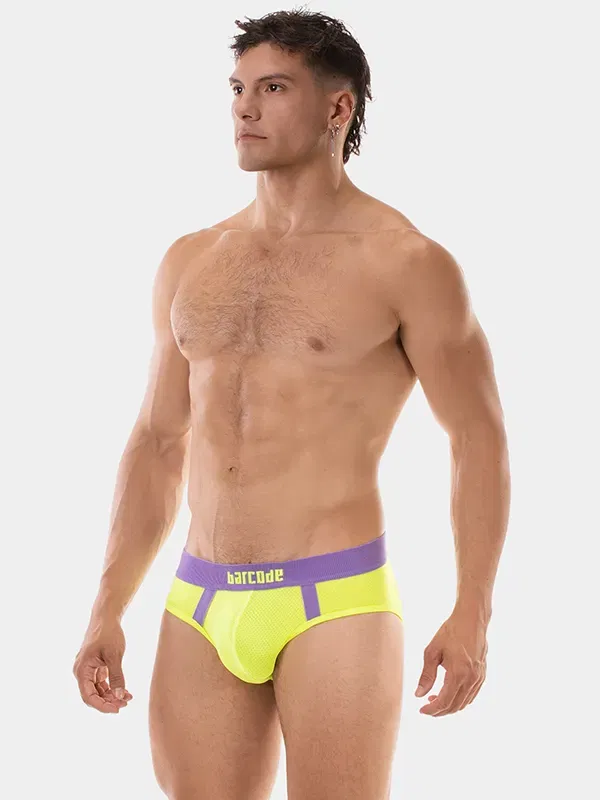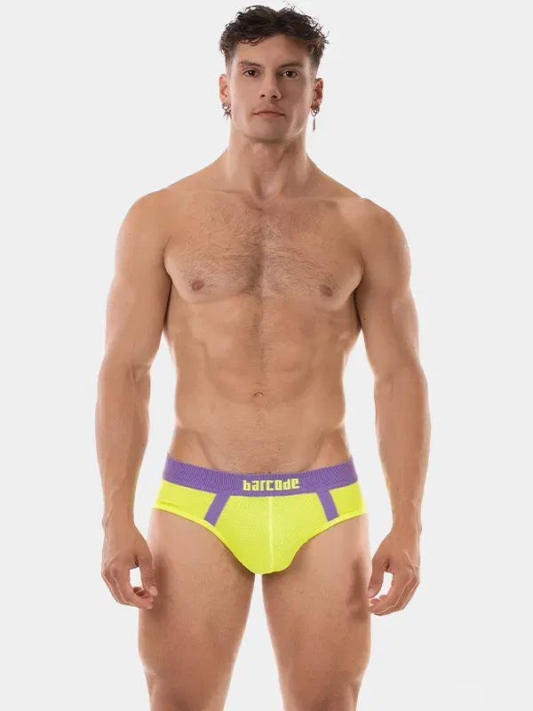 Color que vibra y tejido que respira. Sonny es un slip de mesh ligero en verde neón con cintura morada y logo barcode en contraste. Acompaña tus movimientos, evacua la humedad y mantiene un tacto fresco incluso cuando sube la temperatura del club o del gym.