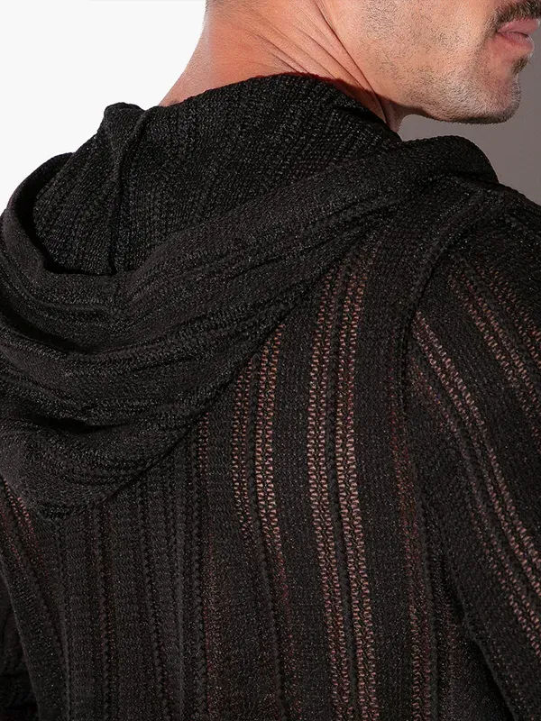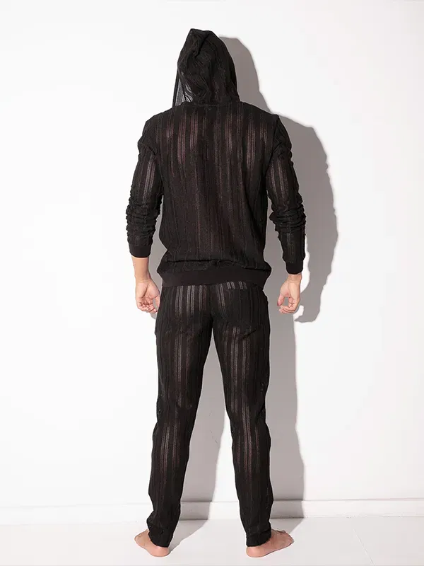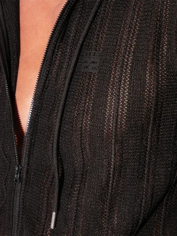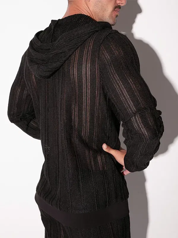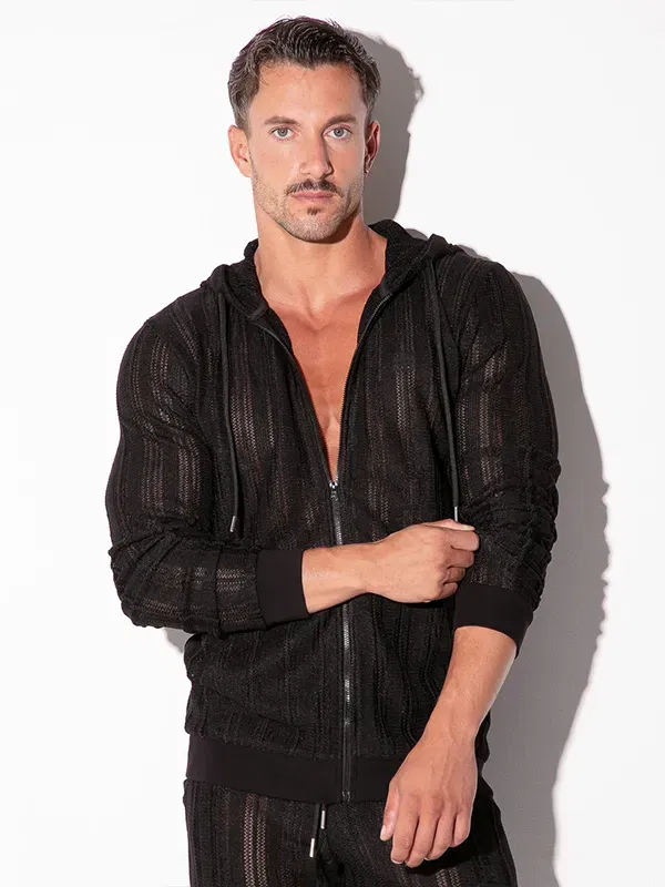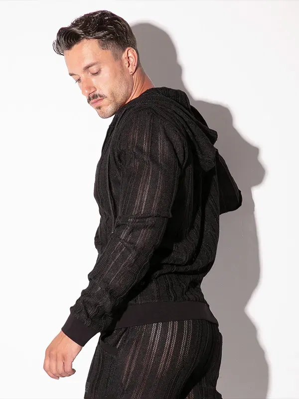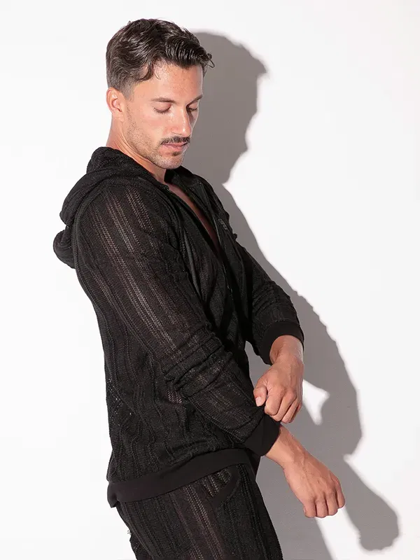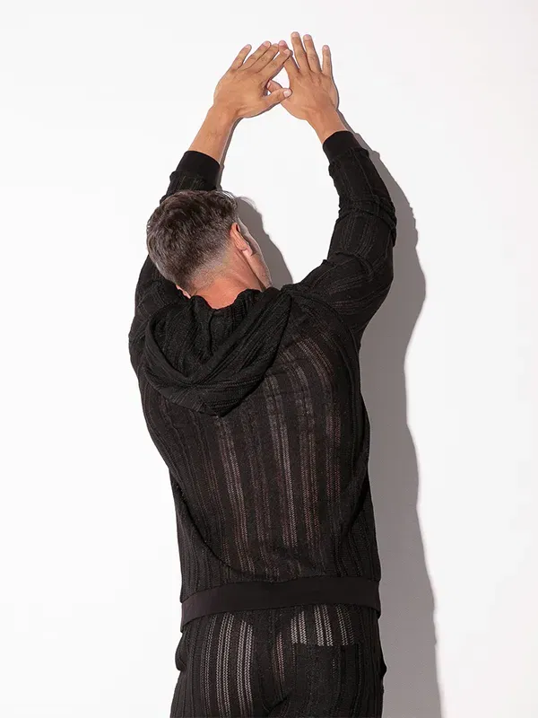 La sudadera Code 22 Oasis toma el lenguaje del clubwear y lo lleva a la calle: jacquard calado negro con textura a rayas, caída ligera y un punto de transparencia que estiliza sin perder confort.