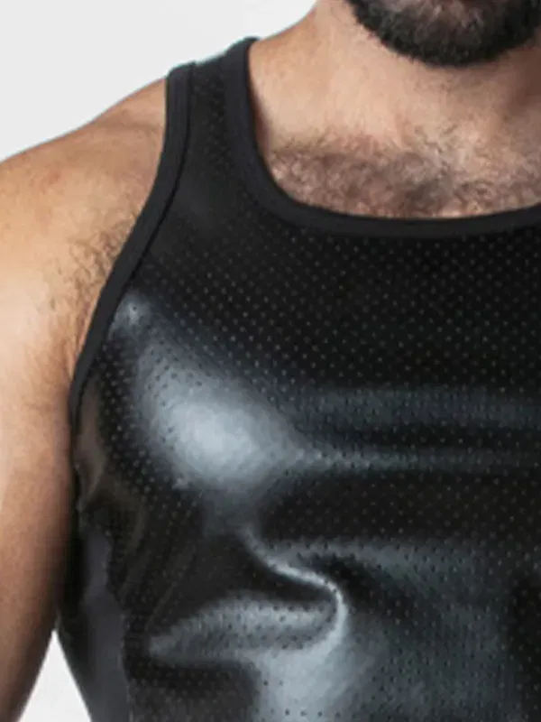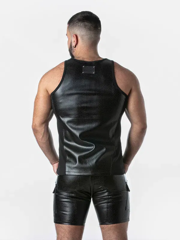 Esta camiseta de tirantes Locker Gear en efecto cuero negro envuelve el torso con un brillo perforado que marca el pecho y los hombros,