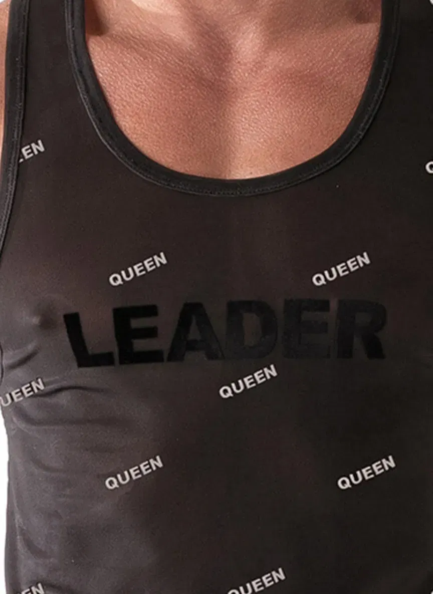 Ligera, elástica y con brillo de reina. La Leader ID Mesh QUEEN es un tank top de malla fina semi-transparente que sugiere sin enseñar. En el pecho, el logo LEADER en textura aterciopelada; por toda la prenda, el microprint QUEEN que declara tu identidad.